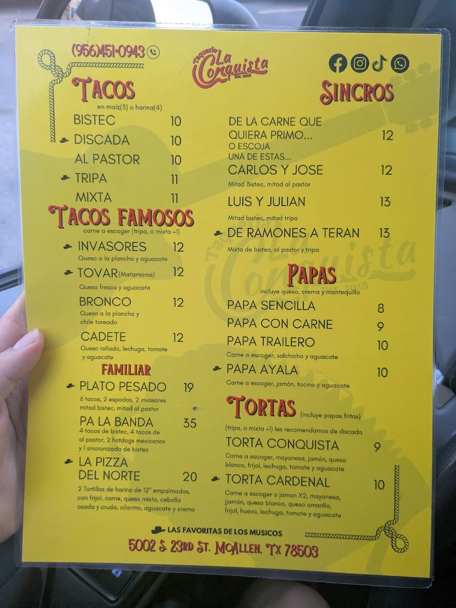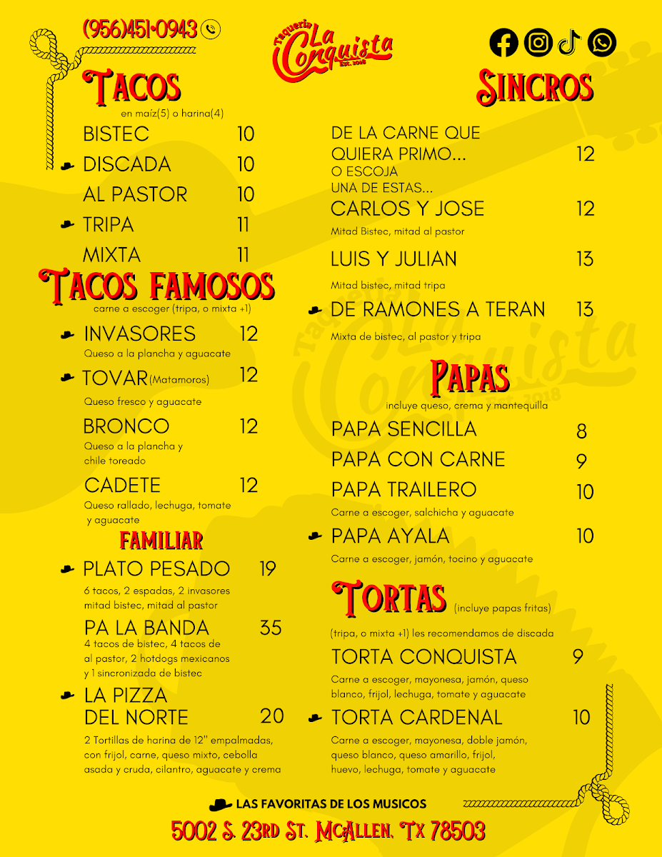 The menu at Taqueria La Conquista is a bold celebration of northern Mexican street food with an impressive range of flavor-packed options. For taco lovers, choices like BISTEC, DISCADA, AL PASTOR, TRIPA, and MIXTA offer a rich diversity of textures and spices. The standout TACOS FAMOSOS, including INVASORES, TOVAR (Matamoros), BRONCO, and CADETE, elevate the traditional taco experience with signature creations unique to the house.