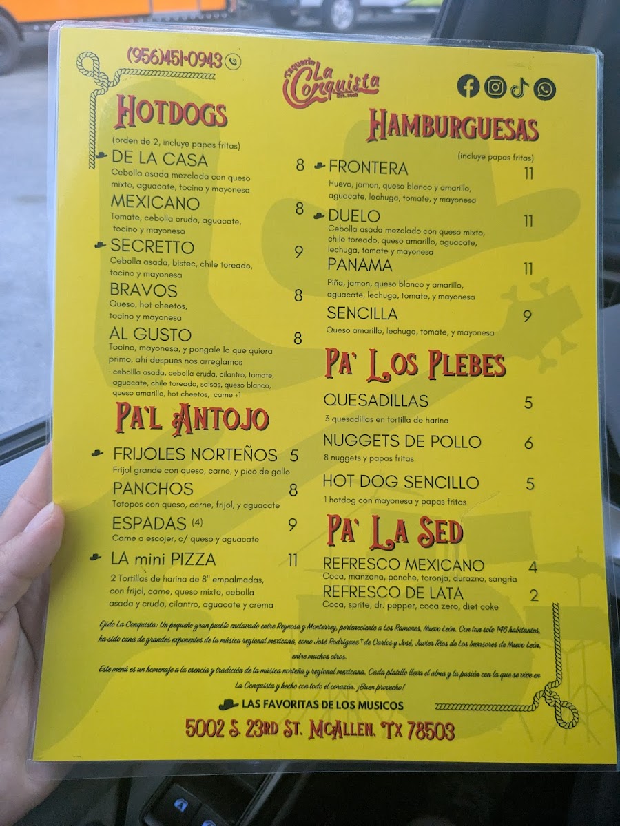Comfort food fans will enjoy the HOTDOGS such as DE LA CASA, MEXICANO, and SECRETO BRAVOS, while burger options like the FRONTERA, DUELO, and PANAMA SENCILLA bring a Tex-Mex twist to American classics. The loaded potatoes in the PAPAS section-especially the PAPA CON CARNE and PAPA AYALA-are hearty and indulgent.